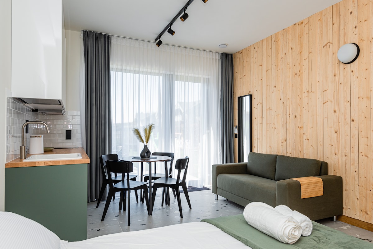 Wake up to the sound of waves and fall asleep to sea breezes – welcome to the Palanga's closest home to the beach. This spacious, light-filled studio offers a rare combination: direct dune access, a private balcony, and all the comfort for a relaxing coastal escape. Just a 2-minute stroll along a wooden path takes you over the dunes and straight to the beach. Whether you're sipping your morning coffee or enjoying a quiet sunset, the balcony becomes your front-row seat to the rhythm of the sea.