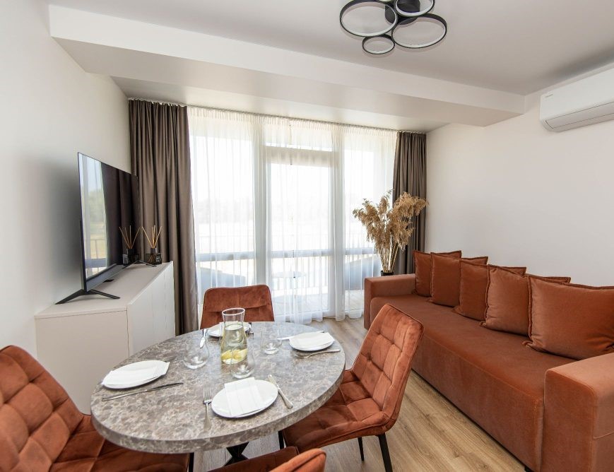Tai puiki vieta ramiam poilsiui prie jūros, tolėliau nuo kurorto šurmulio ir 200 metrų iki jūros. Apartamentai įrengti 2020 metais - tai šviesus, modernus ir erdvus butas šeimai. Apartamentų plotas 60 kv. m. 2,5 kambario. Čia apsistoti gali iki 6 asmenų. Virtuvėje yra visa reikalinga buitinė technika bei indai ir įrankiai, tad galėsite šeimininkauti kaip savo namuose. Butas yra 3 aukšte, o pro langus atsiveria puikūs vaizdai.