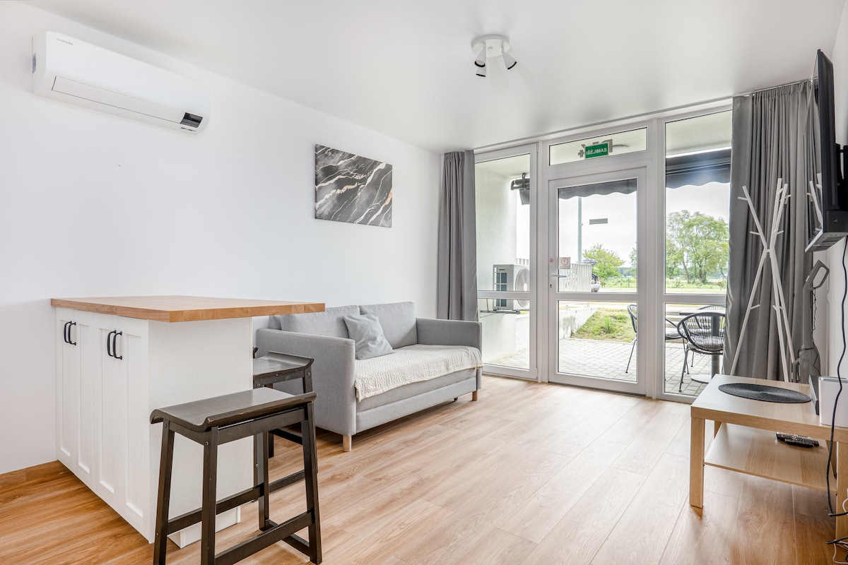 One room flat in Šventoji. In twenty-seven square meters, you will find a kitchen with all the needed equipment, a sofa to watch favorite movies, and a bed which can be used for a sweet night's sleep and be folded during days to get extra space. For comfortable living there is a dishwasher, washing machine, and oven. Also, in the common areas you can use a pool, a gym, and a co-working zone.
