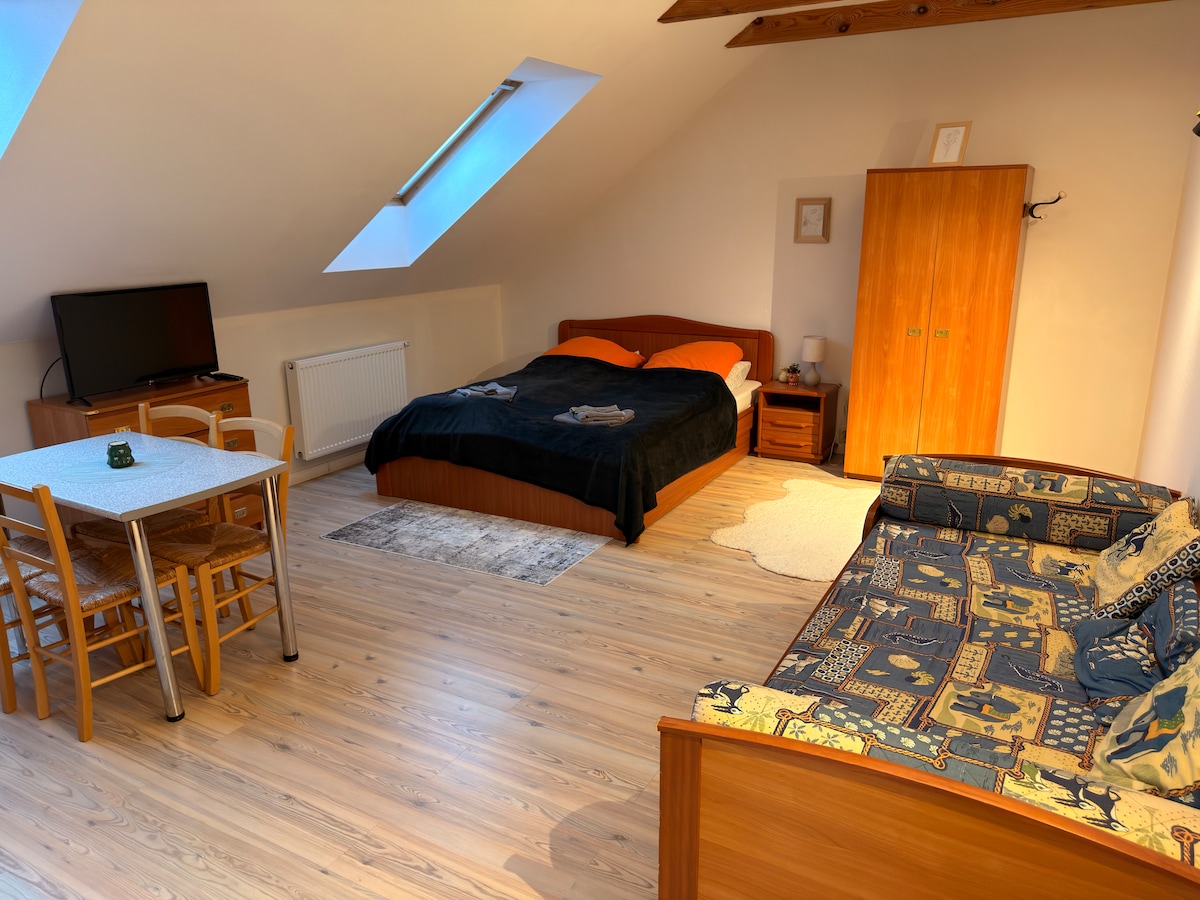 Family room with a double and a bunk bed, TV. The bedroom are equiped with the shower and two toilets. On the site you will find a huge sitting/kitchen area with the fridge, microwave, coffe mashine, kettle, all dishes and toaster. After a long day by the sea and in the city you can enjoy calm and time in the sitting area by the TV.