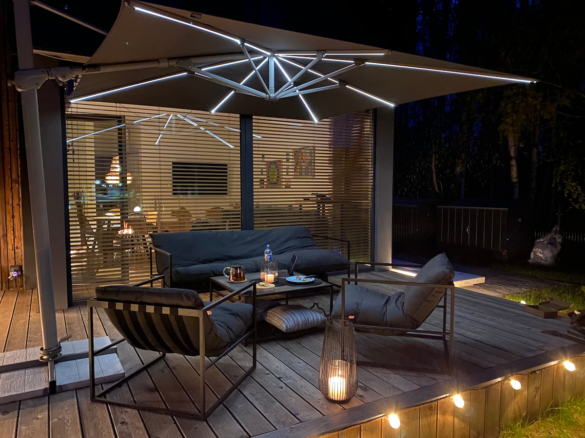 Looking for a peaceful yet active getaway in nature? This stylish cabin by the pond is ideal for couples, families, or friends. Large panoramic windows, a terrace for morning coffee, a private sauna, BBQ grill, and fast Wi-Fi. Just 5 min to 313 Wake Park and 5 km to the Baltic Sea.