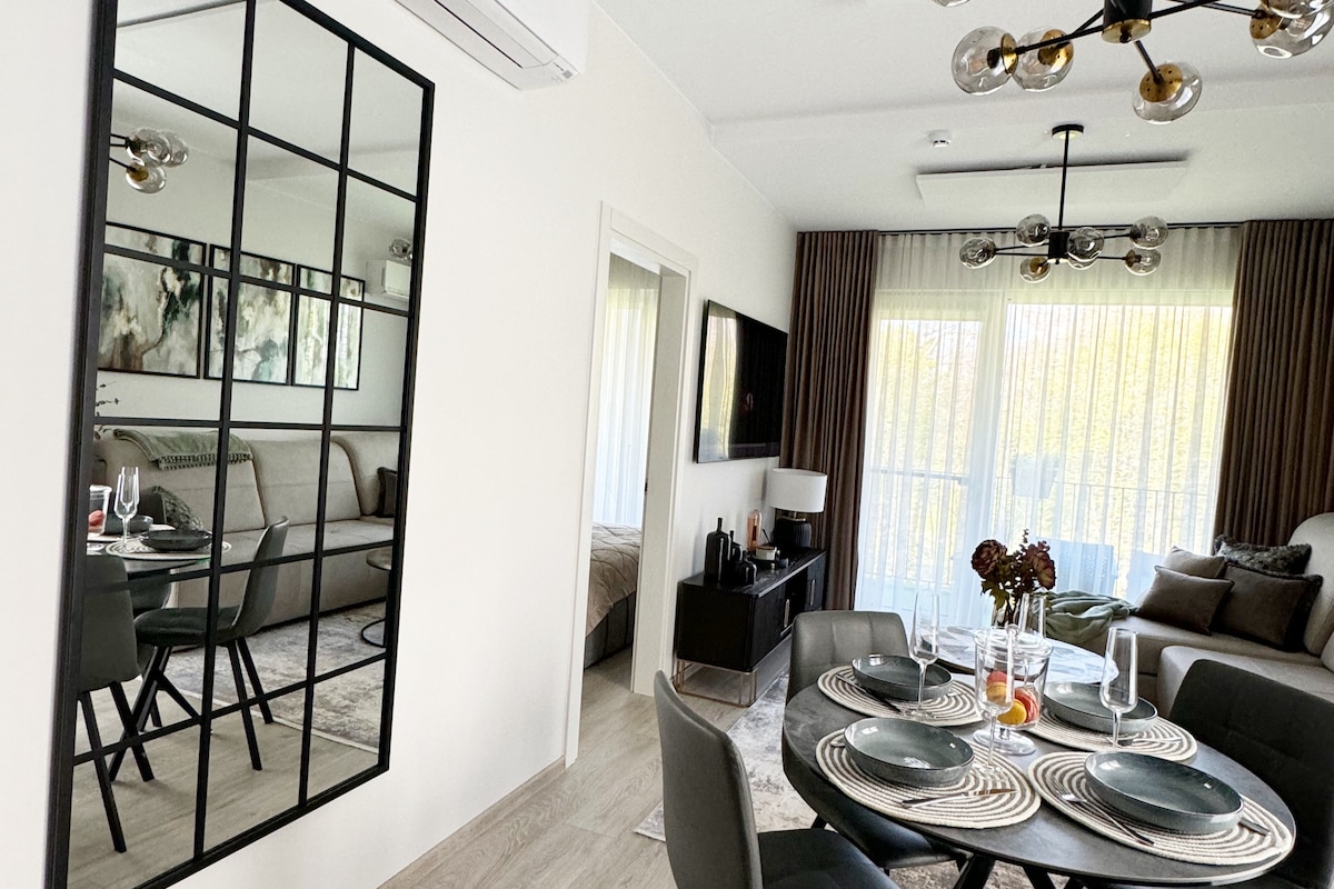 A stylish and cozy 1 bedroom apartment in Kunigiškės, within the gated Mano Jūra II complex. The apartment is modernly designed for your comfortable stay, surrounded by the peaceful pine forest of the seaside. The spacious balcony offers a relaxing spot to enjoy the fresh coastal air. The beach is just a 10-minute walk away, with the Pasaka restaurant nearby. The Aibė store is a 5-minute drive away, and a bike path is close by.