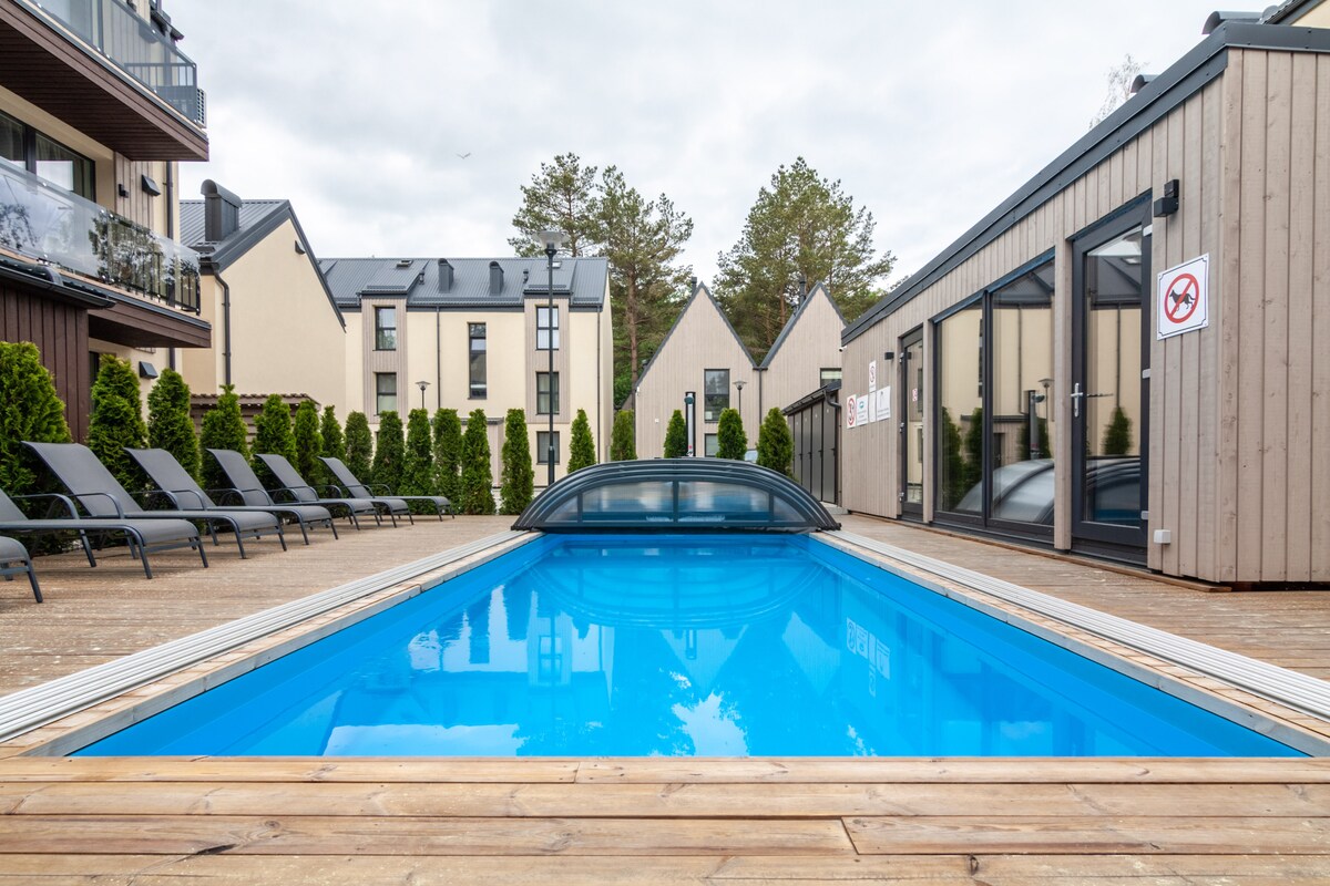 Discover tranquility and luxury at the stunning Sunset Apartment in the “Mano Jūra 3” complex. This modern apartment features a spacious terrace, an eco-friendly pool, an outdoor hot tub, and various other amenities. Inside, you’ll find a fully equipped kitchen, a cozy living room with a sofa bed, a well-appointed bedroom, and a contemporary bathroom. Enjoy fast Wi-Fi, a Smart TV, and air conditioning for ultimate comfort. Perfect for a family vacation or a romantic getaway.