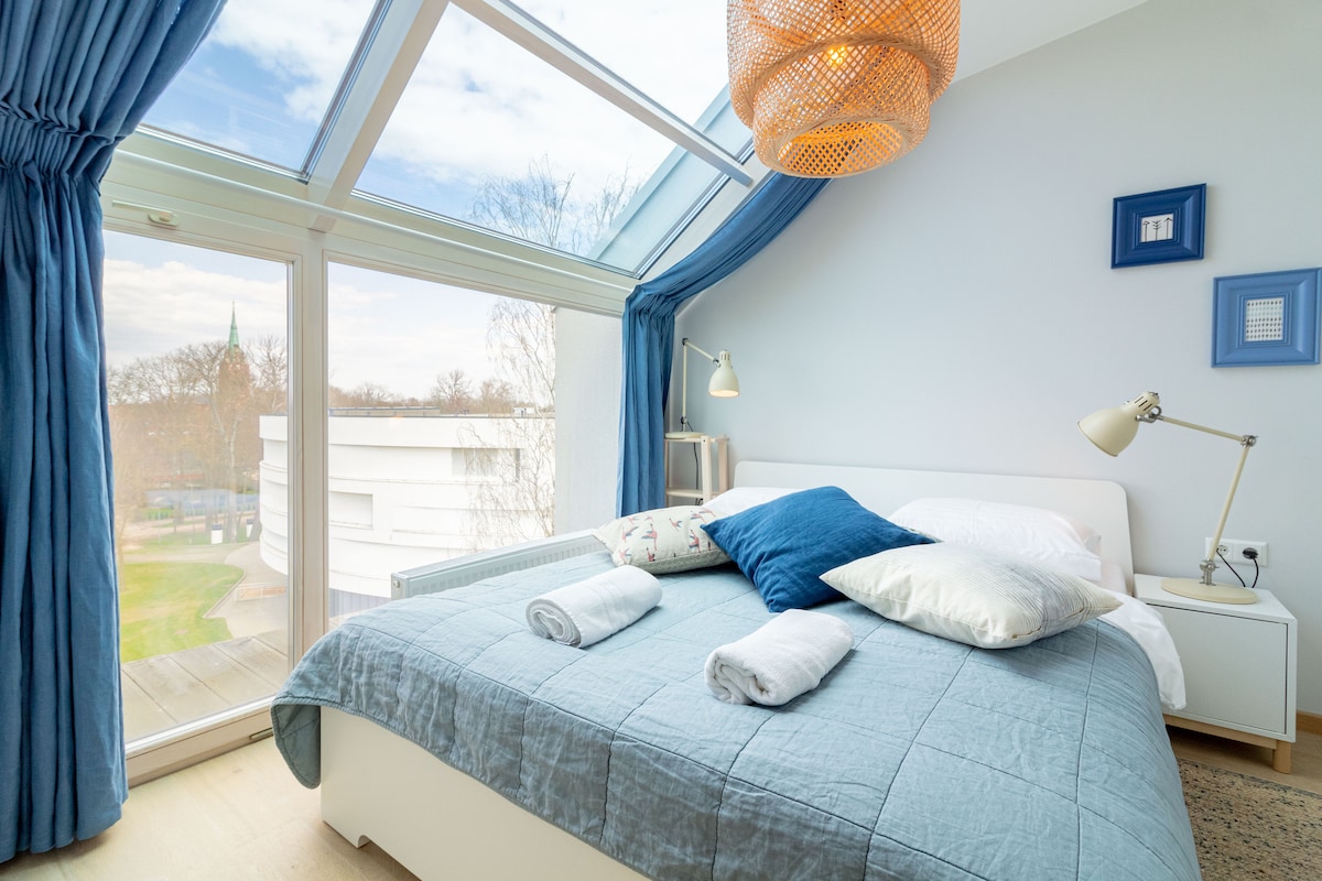 Modern and fresh apartment is waiting for you. Here you will have two most important things at the same time: calm atmosphere and city centre just a step away. Find peace and comfort here. Sleep like on the cloud in the bedroom with roof window. Cook like a Gordon Ramsay in the kitchen (kitchen is fully equipped). Rest like a England's Queen in the living room. Enjoy sound of wind in the balcony. Bathroom is sparkling clean like in the Dexter's laboratory. It's like a dream, it's Deja Blue.