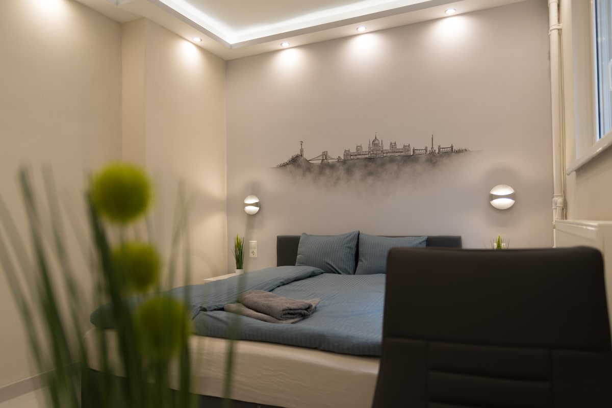 Beautiful, modern, bright and newly furnished apartment with balcony in the 13rd district close to the Danube! FREE PARKING in the garage. Lovely and peaceful location, however it has quick access to the city center (Deák square 12 min by metro/no transfer). The metro station is 150 m from the apartment! Free gifts for our guests! It can accommodate 4 people. The air-conditioned apartment has a bedroom for two (king bed - 180x200), a spacious living room with a sofa-bed for two (150x200).