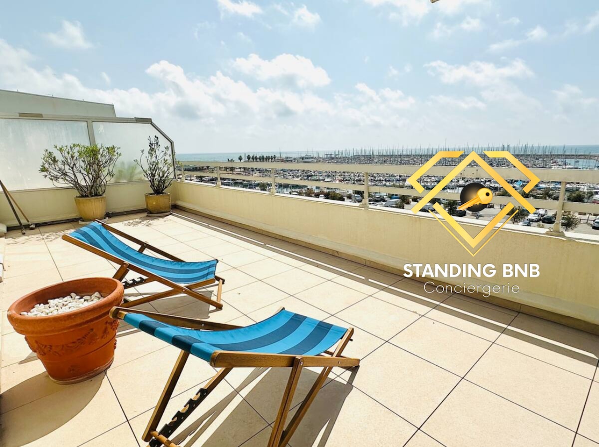 appartement haut de gamme, en première ligne face à la mer et au port de plaisance, avec vue époustouflante.(photos prise de l'appartement) Tout confort: SDB et WC séparés. On trouve tout à proximité: restau, cafés,magasins d'alimentation, bureaux de tabac et journaux et pour se détendre après un bain à la plage en face,un casino Partouche à 2 pas! Convient à un couple sans ou avec 1 enfant.