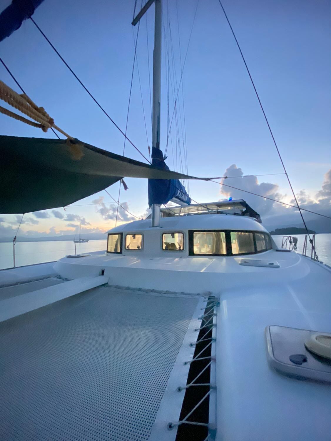 Welcome aboard Sailing Yacht Kalayaan (Freedom), The Yacht is 38ft (12m) owners version Lagoon 380 Sailing Yacht or better still a very stable twin hull vessel known as a Catamaran. The yacht will remain stationary on anchor or mooring (Unless otherwise arranged) with the ocean literally at your back steps. Should you wish to go ashore to the local beach or head into town for supplies a crew member will transfer you in the vessels small boat.