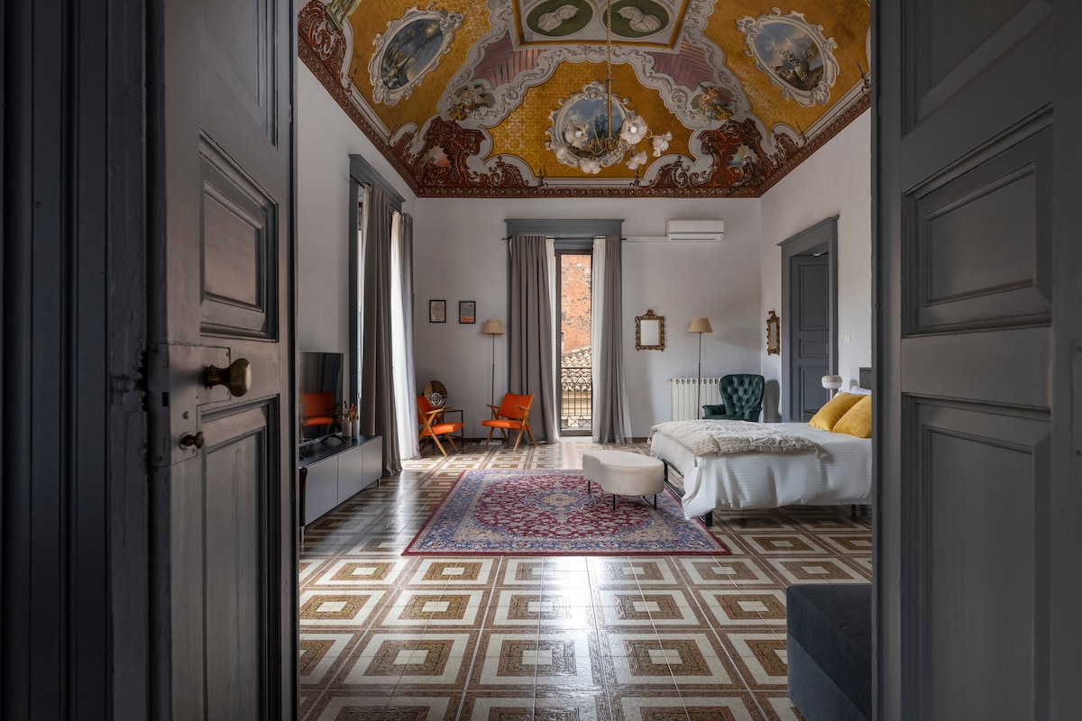 Immerse yourself in history and style in the heart of Catania. This elegant apartment sits inside a 19th-century palace adorned with original frescoed ceilings, a rare chance to stay somewhere truly authentic. High vaulted ceilings and six balconies overlooking the historic center bring in natural light and a sense of space. Just a 5-minute walk from Piazza Duomo, the famous fish market and Teatro Bellini, you're perfectly placed to experience the authentic Catania. Private parking available