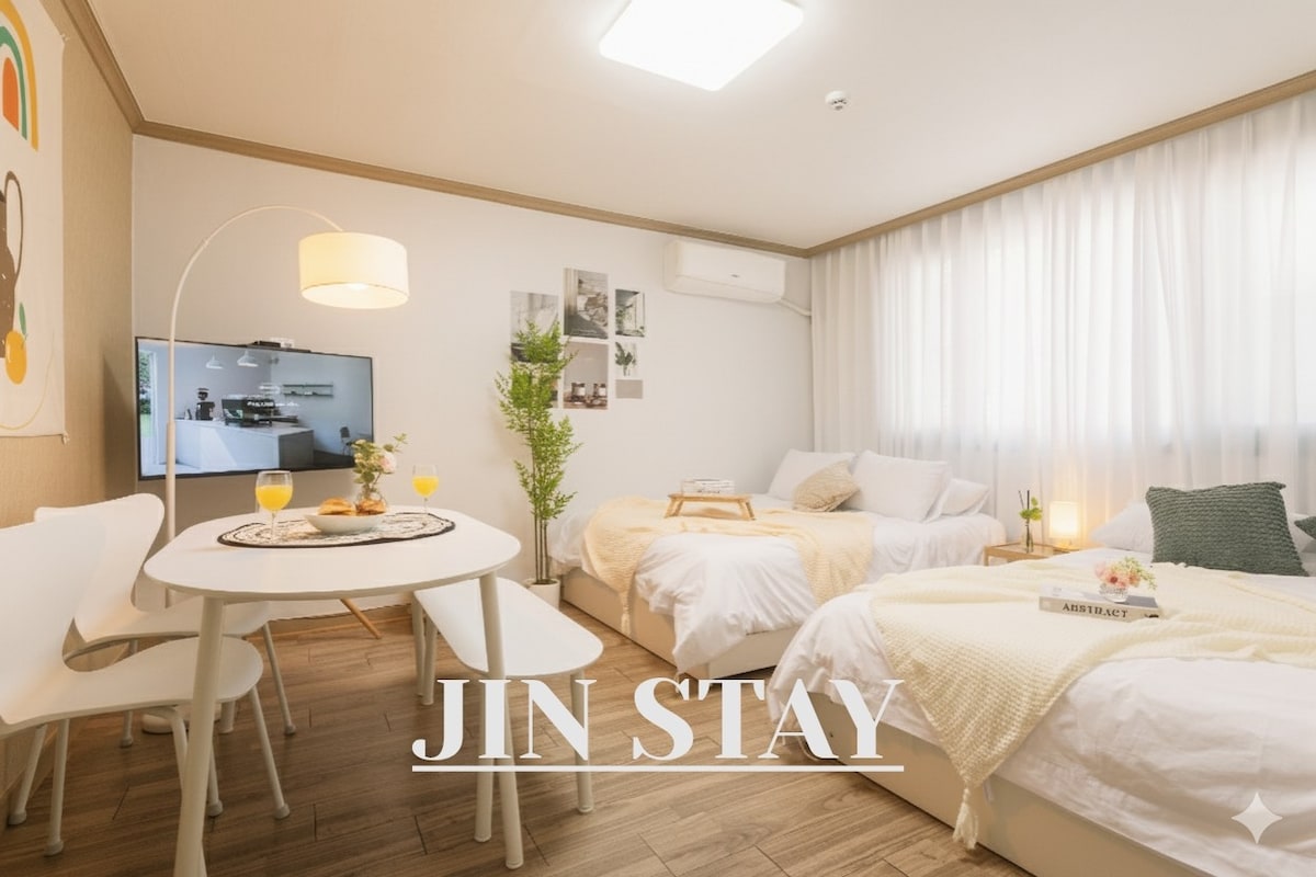 세계문화유산 화성행궁의 중심 행리단길 중심부에 자리하여 입지적 편리함과 세련된 스타일을 모두 갖춘 공간입니다. 감성적인 인테리어로 꾸며진 공간을 여유롭게 이용하실수 있으며 장박문의 가족단위 환영합니다:) 숙소의 모든 침구류는 고온 건조로 살균처리하여 매일 교체합니다. * 기준인원은 4인, 최대 6인까지 가능합니다. (추가요금 있음, 6인이상 시 사전 문의 필수) ⭐️체크인16시/체크아웃12시 🏠 방2, 침대3, 욕실1 쾌적하고 깨끗한 침실에서 온전한 휴식을 누리세요. *침실1 - 퀸사이즈 침대2, 행거, 화장대, TV, 간접 조명, 거울, 고데기, 멀티충전기 등 *침실2- 퀸사이즈 침대1, 소파, 테이블, 간접 조명, 벽행거 *거실 스마트티비로 음악을 감상하거나 넷플릭스, 유튜브를 이용하며 즐거운 시간을 보낼 수 있습니다. (넷플릭스 무료) (스마트TV, 전신거울, 다이닝테이블, 의자 등)