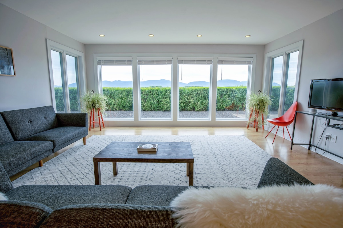 Modern and spacious house located in the woods, surrounded by nature will make a perfect getaway. Wide open layout with a large living room/kitchen area in the center of the house, 2 Massive suites, one on each side overlooking the woods, both with comfy king bed and private bathroom - perfect for 2 couples, and suitable for a family as well. Beautifully designed with high end finishes, white oak flooring, custom made kitchen and toll ceilings, as well as cozy fireplace for warm nights.