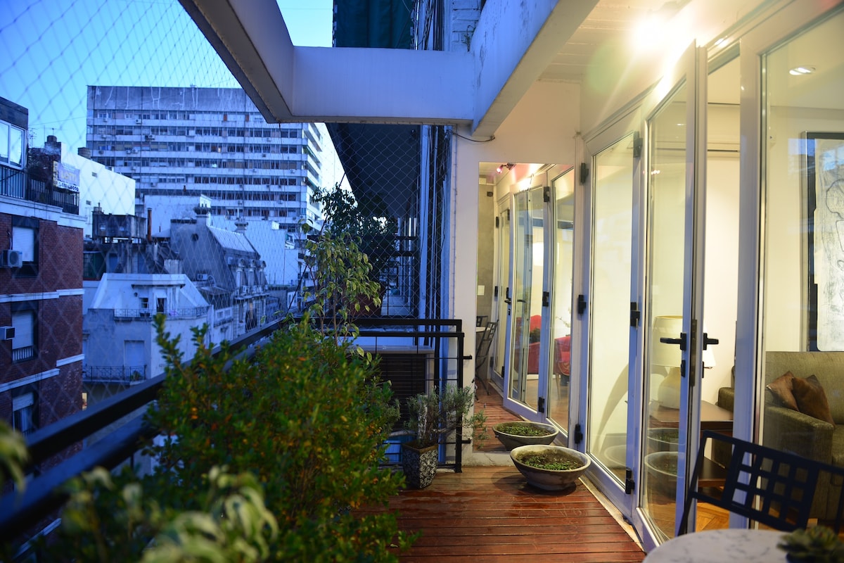 Located in the pulsating heart of the city, it was recently remodeled mixing the original style of the 1936 building with modern comforts. It is on the top floor of a corner building, with 24 hour security and 2 elevators. Has 2 bedrooms and a balcony with plants, from where you can enjoy 270° views of the Obelisk, 9 de Julio Avenue and Corrientes Ave. A/C in both bedrooms, washing machine, WIFI, fully equipped kitchen, modern and chic.