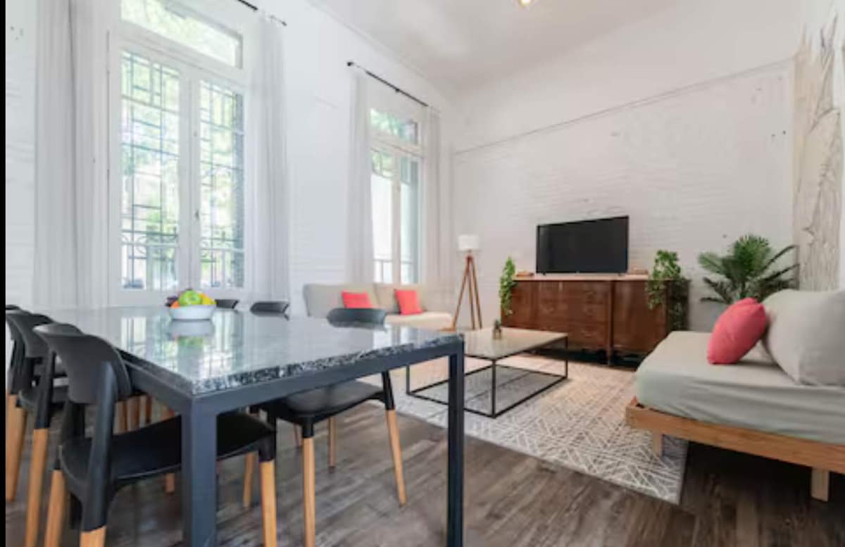 Bright 70 m² apartment for up to 4 guests, on the 7th floor with elevator access. Two bedrooms: master with queen-size bed and balcony; second bedroom with two single beds that can be joined upon request to form a queen-size bed. Living–dining area, equipped kitchen, full bathroom, and balcony. Bed linens and towels provided. Wi-Fi included. Personal check-in. Prime location in San Telmo, just 20 meters from San Telmo Market, walking distance to Plaza de Mayo and Puerto Madero.