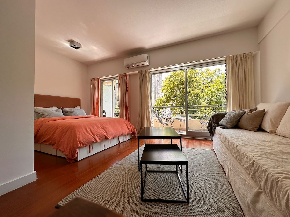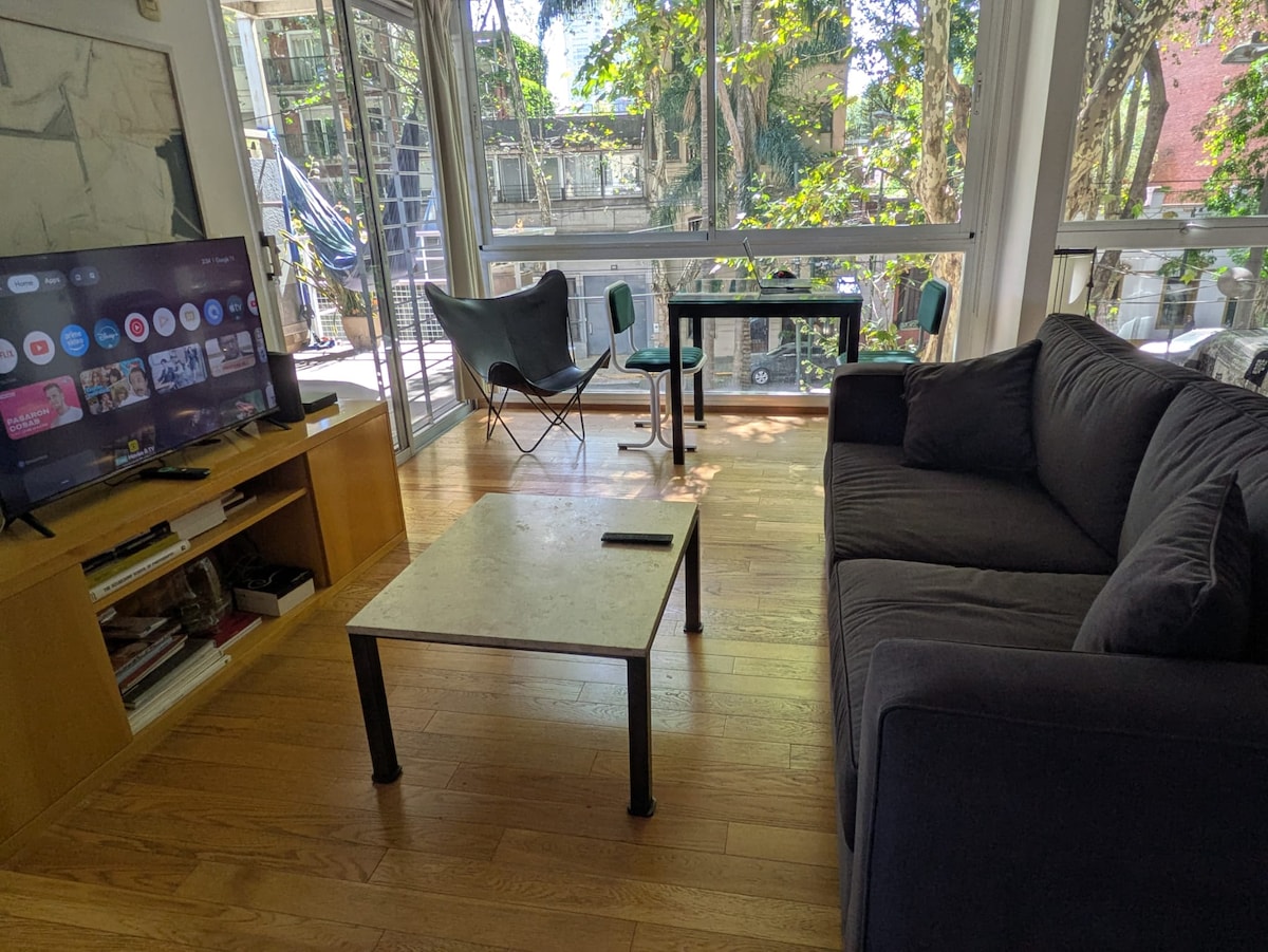 Hola somos Florencia y Gastón, te ofrecemos un departamento 2 hamb. alegre en Palermo Soho (Guatemala y Thames). Dormitorio cama queen re cómoda. Living, mesa escritorio para trabajo remoto. Sillón cama simple. Cocina. Balcón terraza entre los arboles, con mesa y sillas. Internet de alta velocidad para trabajar. Smart TV, chromecast, netflix. secador de pelo, placha, nespresso, licuadora, lavarropas. Todo lo que necesitas. Barrio hermoso. Polo gastronómico y comercial. Plazas lindas y cerca.