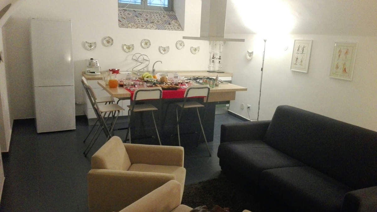 Artepalermo is a Bed and Breakfast apartment in the heart of the historic centre of Palermo, on the top floor of an old, renovated house, without elevator and surrounded by lanes, churches, markets, washing, squares and terraces. You will live in the house of an artist and you can visit her studio. Your room is more than 25 square metres, it has a double and a single bed, a sofa, a bureau and a balcony There is a shared sitting room, a shared dining room, a roof terrace, another atmospheric little terrace and a kitchen where you can also cook. You will have a private bathroom, but it is not in the room itself. The furniture and the style of the apartment are basic with an artistic touch. There is free quick unlimited internet( fibre). As we are really in the heart of the centre you can walk within a few minutes to the food markets, supermarkets, flea markets, shops, restaurants, musea, port and parcs. it is less than 5 minutes walking to the sea! The centrale train station is at 10 minutes walking. In case you arrive by car (but you don't need it in Palermo) : you are not allowed to go into the historic centre without a special pass ( the ZTL), but you can park on the Foro Italico (near Porta Felice is the nearest). If somebody asks you money, give him maximum 1 or 2 euros. We are a Dutch woman, a Tunisian man and a Sicilian dog We speak English, Italian, French, German, Spanish, Portuguese, Dutch and Arabic.