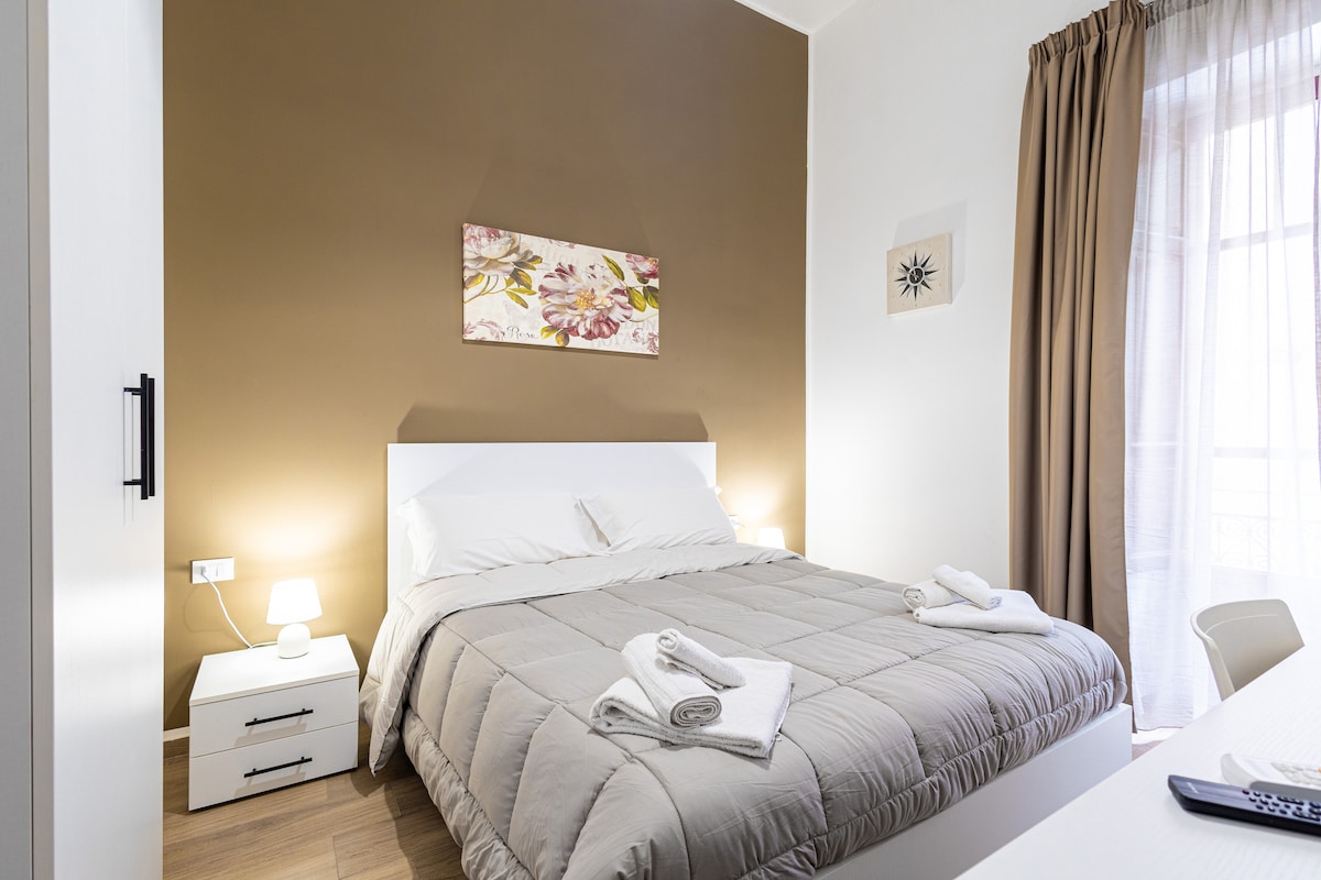 king deluxe room with balcony, private bathroom. Free parking on the street or private paid parking. The room is equipped with a LED TV, desk with chair, clothes hangers, minimal backlit recessed bedside tables, a USB socket, a personal HOTSPOT WI-FI in the room, air conditioning, radiator heating, wooden thermal break windows, bed with orthopedic base and Memory Foam mattress with Memory pillow.