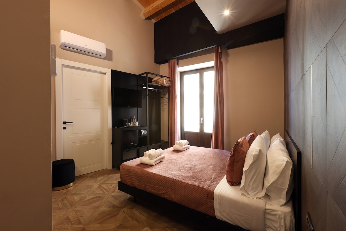 king deluxe room with balcony, private bathroom. Free parking on the street or private paid parking. The room is equipped with a LED TV, desk with chair, clothes hangers, minimal backlit recessed bedside tables, a USB socket, a personal HOTSPOT WI-FI in the room, air conditioning, radiator heating, wooden thermal break windows, bed with orthopedic base and Memory Foam mattress with Memory pillow.
