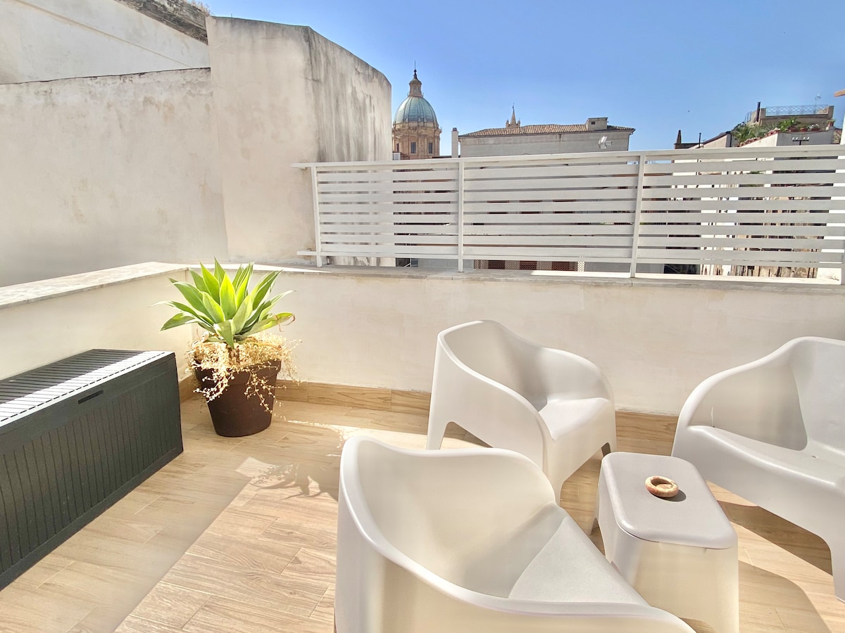Piccolo appartamento luminosissimo su due livelli con terrazza ed ampia vista su Piazza Magione,cuore del centro storico. Palazzo Sambuca e 'uno dei piu' importanti palazzi nobiliari della citta con ampi spazi interni ed impianto a doppia corte. il prospetto insiste su via Alloro asse principale del quartiere della Kalsa. I principali monumenti e le bellezze intorno lo rendono dimora ideale per vivere la vera anima della citta' di giorno e di notte