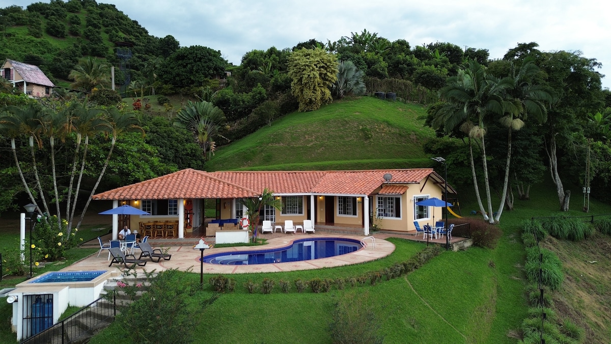 Private villa in the heart of Colombia’s Coffee Region, perfect for families and groups. Enjoy a private pool, jacuzzi, outdoor social kiosk, and two fully equipped kitchens one open-air Surrounded by lush gardens and mountain views, WiFi, a BBQ area, and comfortable bedrooms.Just 1 hour from Pereira Airport,close to Parque del Café, Panaca, Salento, Cocora Valley, Nevados National Park,Santa Rosa Hot Springs. Fully equipped, with an optional local cook for meals extra costYour perfect getaway