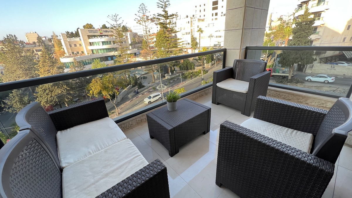 Our beautifully designed 2-bedroom apartment offers a central location in a quiet neighbourhood. Ideal for families, friends, or business travellers, this space includes: - 2 bedrooms with comfortable beds. - Heating/ cooling/ hot water - Fully Equipped Kitchen with a dishwasher. - 2 full Bathrooms - High-Speed WiFi ( fiber) Location : - 5 minutes away from Ramallah Manarah square. - 10 minutes walking from Ramallah municipality track and Mahmoud Darwish Museum.