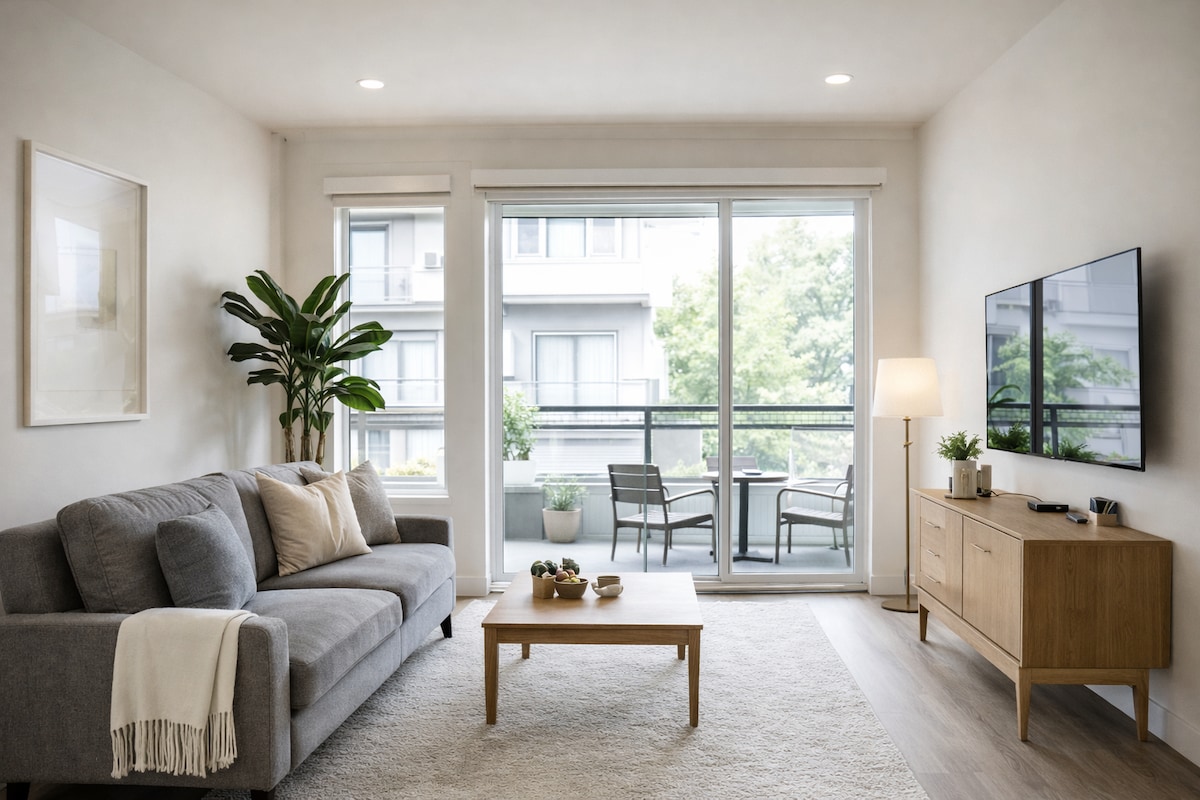 Blue Sand Apartment is a spacious, sunlit home blending deep blue tones with warm sand-colored finishes. A navy feature wall and light flooring create a relaxing coastal-modern feel. The large living space includes a sofa, dining area, and fully equipped kitchen, with windows that fill the room with natural light. The apartment offers two bathrooms and a bright, comfortable bedroom—ideal for families, long-term stays, or guests who enjoy space and simplicity.