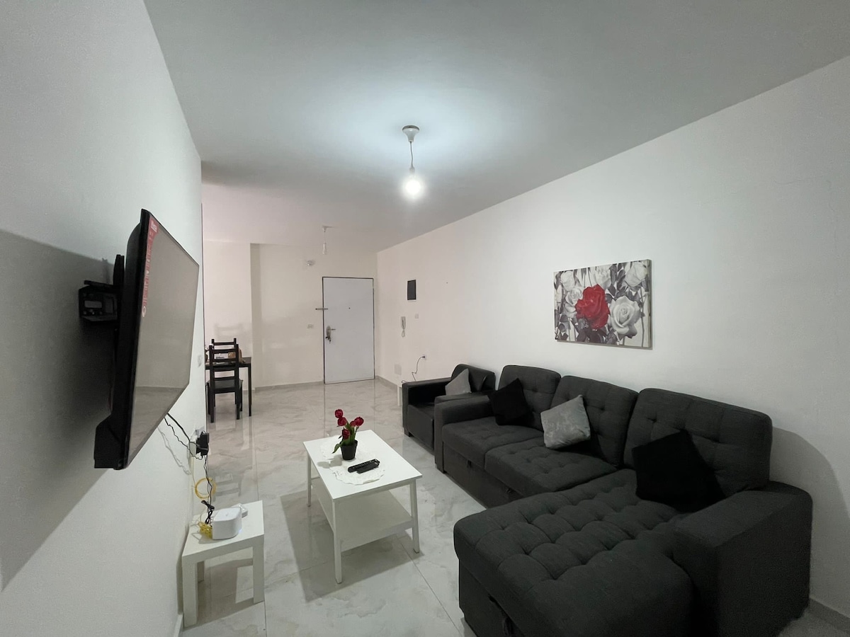 This spacious two-bedroom apartment is a 10 min walk to the city center. Enjoy easy access to transportation, nearby supermarkets, cafes, and shops, along with tantalizing Palestinian cuisine at Taghmeeseh across the street. A medical center and taxi station are also within easy reach for added convenience and stress free stay. unwind in a fully furnished space complete with a sweet balcony and fully equipped kitchen. Perfect for couples, students, small families, and business travelers.