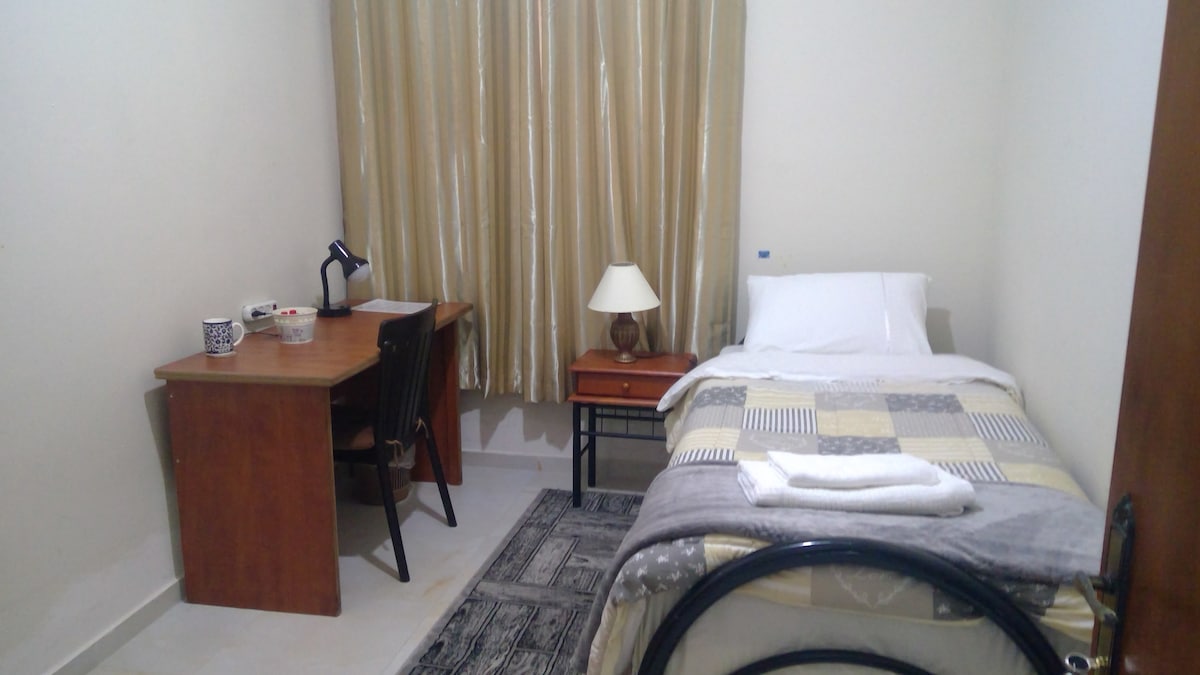 Private room with single bed 110cm, for one guest only, The apartment is a shared home includes 5 bedrooms on the ground floor, in the apartment there are 2 bathrooms, dining area and kitchen, home with a beautiful garden, patio, and outdoor seating area. Renters can rent 1 or multiple bedrooms within the house. The Garden, living room, kitchen, and bathrooms are shared utilities.