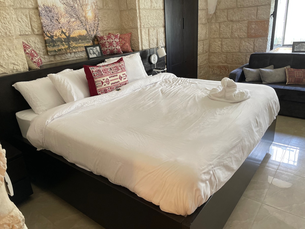 Located in the heart of Ramallah, close to restaurants, cafes, government offices, and the main bus terminal to Jerusalem ..., but tucked away from the busy main streets. Historic home expanded and renovated to have private Luxury Hotel-Style-Rooms. Each room has a private full bathroom, personal room key, refrigerator, coffee, microwave, free Wi-Fi and other amenities.