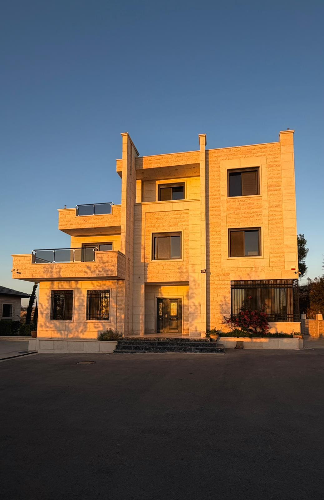 A modern and spacious three-floor building with a stunning panoramic view. The property is fully secure with an alarm system and surveillance cameras, and offers complete amenities along with private parking. It also includes a private outdoor VIP room for guests seeking an elevated experience. Located in a quiet area ideal for comfort, safety, and peace. Just 15 minutes by car from Hebron city center, 30 minutes from Bethlehem, and 45 minutes from Jerusalem.