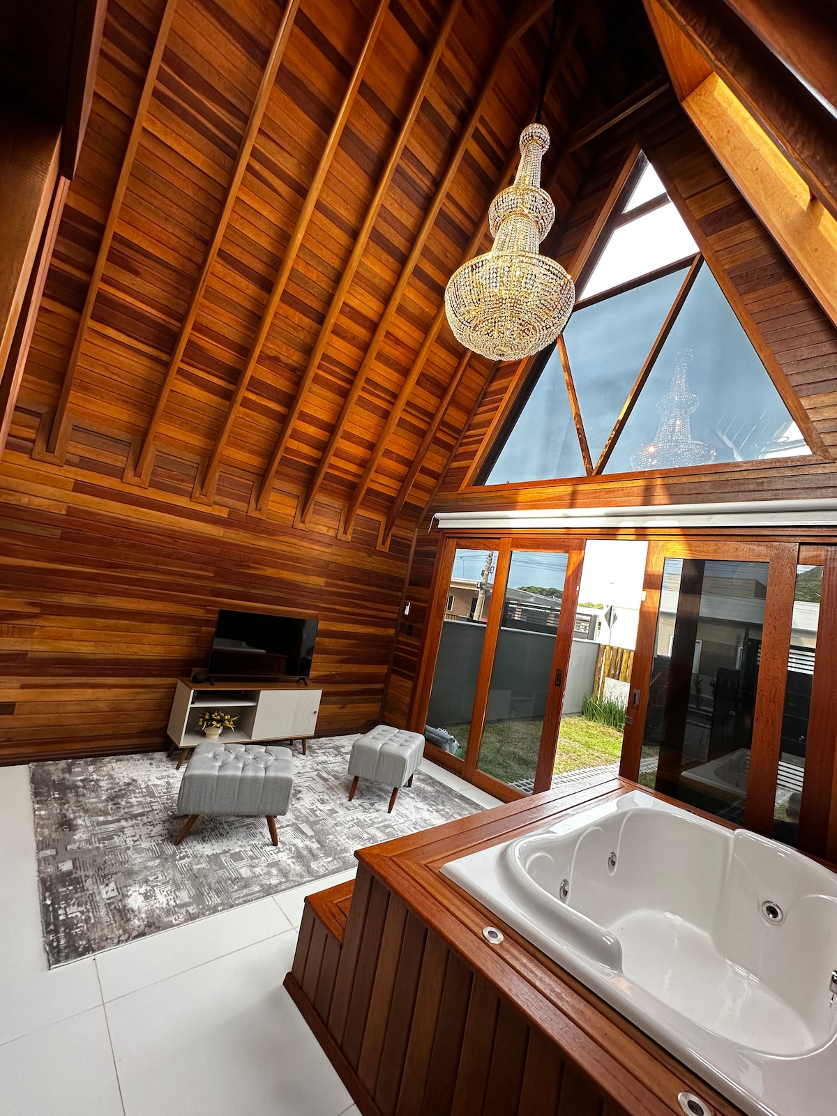 O chalé está localizado a 200 metros da praia com uma linda vista para o mar e fácil acesso. Sacada: Lago com peixes ornamentais. Sala: Banheira com hidromassagem e cromoterapia, TV smart 43" 4K, sofá cama com três posições de ajustes. Cozinha: Wi-Fi, Alexa, fogão de indução, forno com air fryer, frigobar, chaleira elétrica, liquidificador e demais utensílios. Banheiro: Torneira e chuveiro com aquecimento a gás. Quarto: Cama de casal e dois abajures. Chalé climatizado.