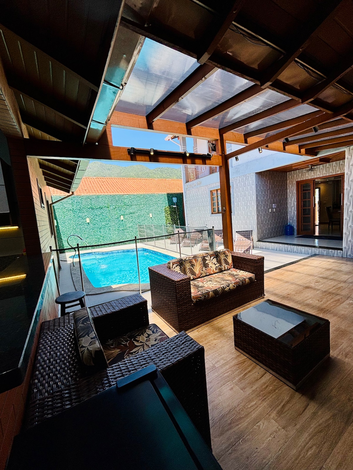 Casa nova, recém construída, 150 mts da praia,são três andares sendo no primeiro sala de estar, cozinha, banheiro, churrasqueira e piscina privativa, no segundo andar são três quartos sendo a suite com sacado com vista para o mar, no ático possui um salão gourmet privativo com fogão de ilha, churrasqueira e forno a lenha, vista de toda praia. Possui gerador Um ótimo lugar para relaxar e aproveitar os bons momentos da vida