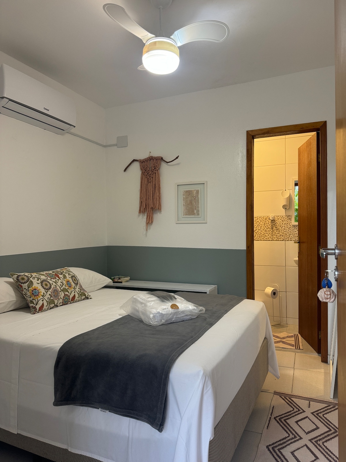 A acomodação no piso superior oferece uma suíte totalmente privativa, com acesso independente, cama de casal, cama auxiliar para um 3º hóspede, SmartTV, ar-condicionado, frigobar, roupas de cama e banho e banheiro completo. Conforto, privacidade e praticidade para uma estadia acolhedora e inesquecível.