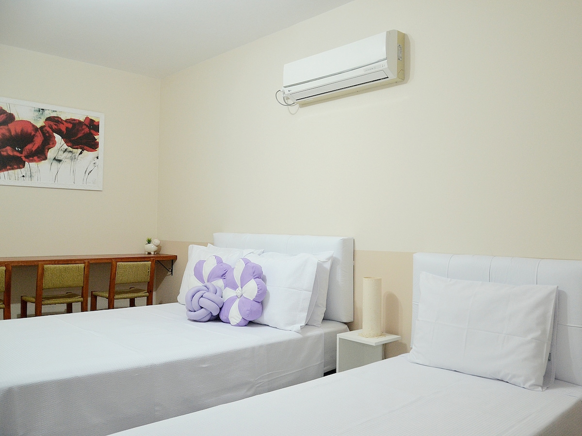 O quarto está equipado com uma cama de casal e duas de solteiro, com a opção de disponibilizar dois colchões adicionais para hóspedes. Inclui ar condicionado, banheiro privativo com ducha, TV e frigobar.