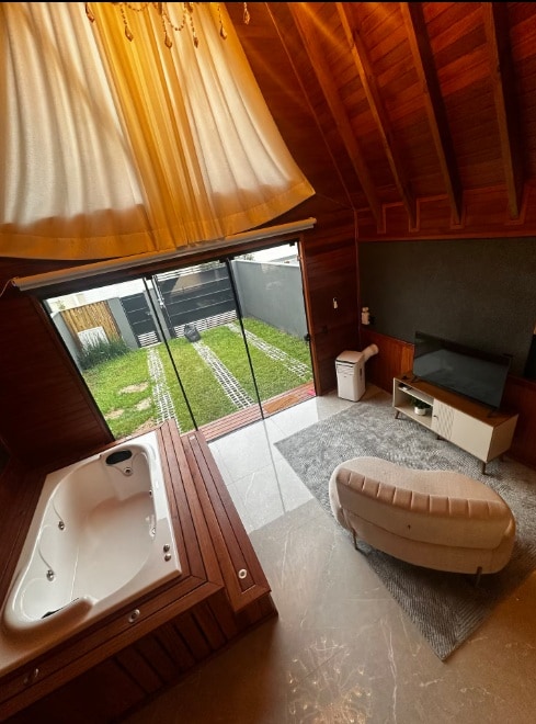 O chalé está localizado a 200 metros da praia com uma linda vista para o mar e fácil acesso. Sacada: Lago com peixes ornamentais. Sala: Banheira com hidromassagem e cromoterapia, TV smart 43" 4K, sofá cama com três posições de ajustes. Cozinha: Wi-Fi, Alexa, fogão de indução, forno com air fryer, frigobar, chaleira elétrica, liquidificador e demais utensílios. Banheiro: Torneira e chuveiro com aquecimento a gás. Quarto: Cama de casal e dois abajures. Chalé climatizado.