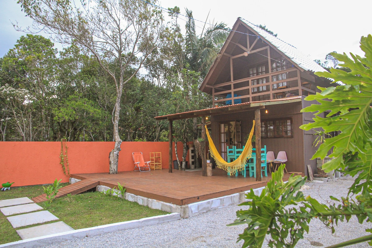 Casa bem iluminada, arejada e aconchegante. Um quarto com cama de casal, mezanino com colchão casal. Um banheiro (chuveiro elétrico). Área externa com chuveiro, tanque, churrasqueira e estacionamento. Cozinha completa. Varanda e sacada com vista para a Pedra do Urubu. Terreno bem arborizado. Mesmo perto do "centrinho" e da praia (cerca de 5 minutos a pé - 200 metros), o local é tranquilo e resguardado. Procedimentos sanitários adotados para um maior cuidado com a saúde de todos.