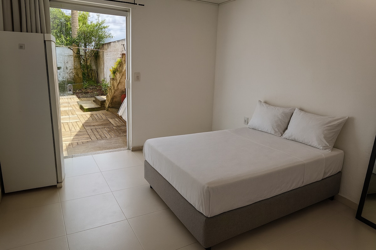Espaço aberto para alugar no segundo piso, com dois quartos de casal com camas Queen e ventilador de teto em cada quarto, cozinha e banheiro externos, sacada ampla com ganchos para rede, possui churrasqueira portátil, estacionamento aberto com portão eletrônico, 600 metros da praia do meio da Pinheira, 5km da Guarda do Embaú e 5 km da praia do Sonho. OBS: Não fornecemos roupas de cama.