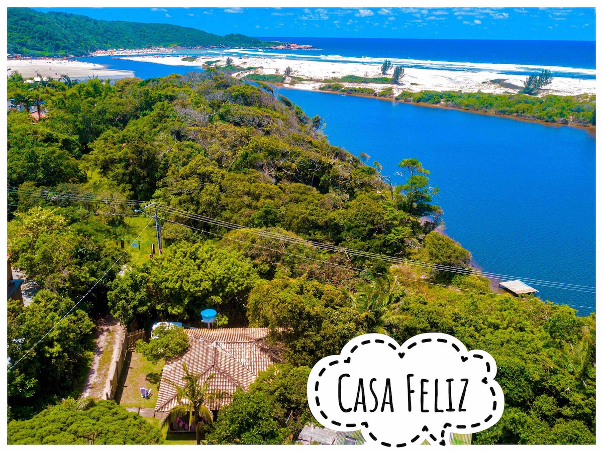 A Casa Feliz é cercada de árvores e com varanda onde os hóspedes possam estar em contatos direto com a natureza ! Uma casa simples mas com todo conforto necessário ! Área totalmente residencial e com tranquilidade perfeito para quem quer vivenciar momentos de paz e tranquilidade numa das praias mais lindas do mundo. A casa tem a alma da Guarda do Embaú .