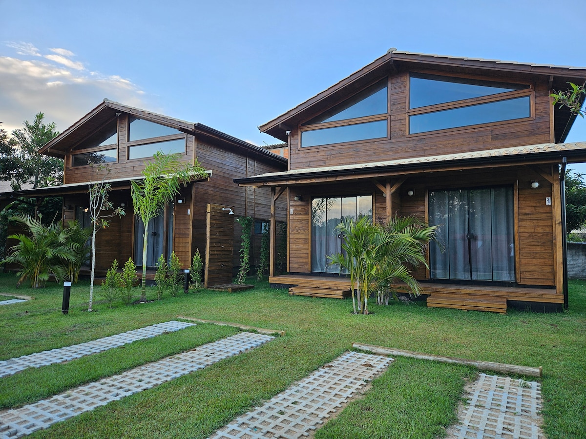 Casa ampla com 3 dormitórios. Primeiro quarto: 1 suíte com cama baixa queem, armário, ar condicionado. Segundo quarto com cama casal, armário e ar condicionado. 1 banheiro social. Segundo andar: mezanino com sofá cama e smart tv. Terceiro quarto com cama de casal queem, armário e ar condicionado. Sala e cozinha conjugada. Área externa com churrasqueira, redes, sofás rústicos para relaxar. Um banheiro sem chuveiro. Jardim, ducha externa. Estacionamento.