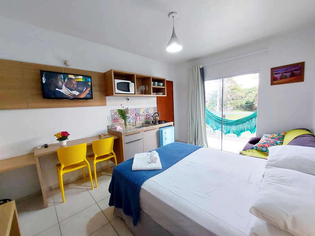Este estúdio encantador é perfeito para sua estadia! Equipado com cozinha completa (menos fogão a gás), cama de casal e conforto moderno, frigobar, micro-ondas, TV com Netflix e Wi-Fi. O ar-condicionado garante bem-estar em todas as temporadas. Desfrute de momentos agradáveis na área externa ampla, que conta com estacionamento e um quiosque com fogão, forno, geladeira e churrasqueira. Próximo à praia e centrinho da Guarda, é a escolha ideal para relaxamento e diversão. Venha aproveitar!
