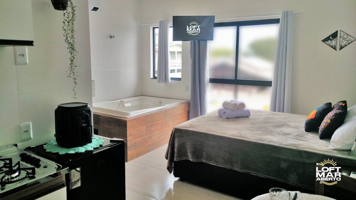 Loft para duas pessoas que valorizam conforto, silêncio e boa localização. Um espaço bem iluminado, organizado e agradável para descansar, trabalhar com calma ou aproveitar a região sem pressa. Oferece cama confortável, ar-condicionado, cozinha equipada e ambiente tranquilo. Ideal para quem busca uma estadia prática e confortável a poucos passos da praia.