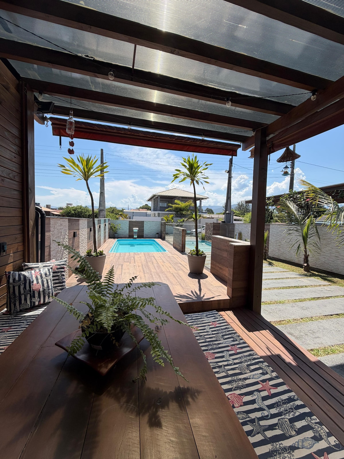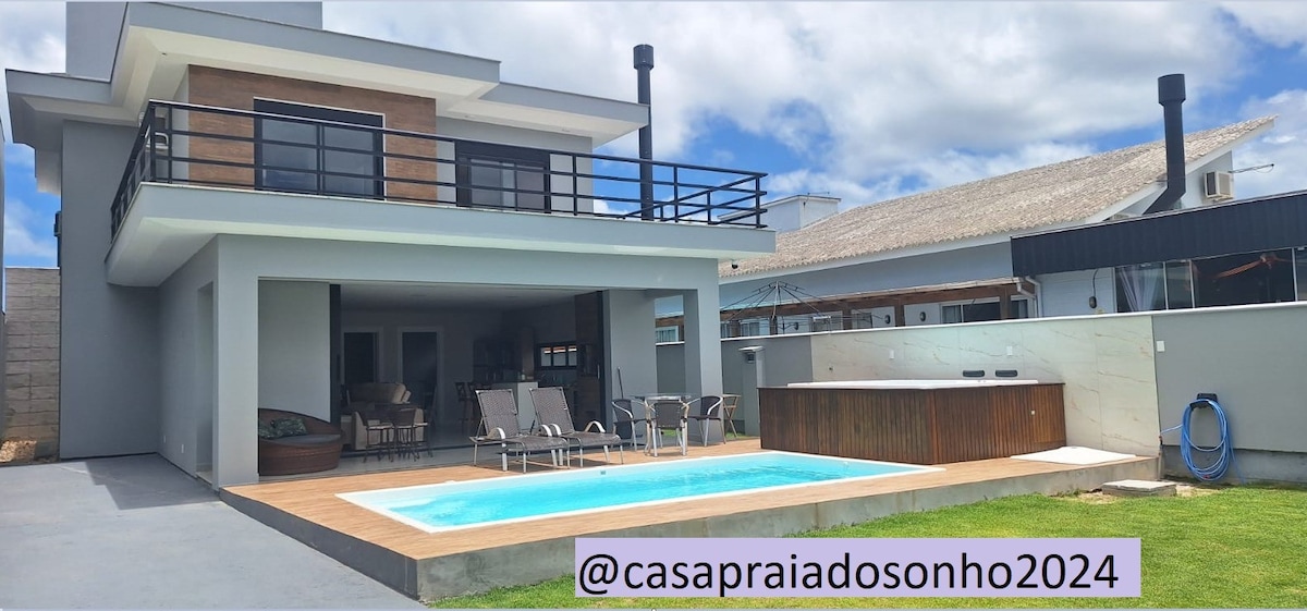 Beach House com piscina está a 600 metros da Praia do Meio - Pinheira, pronta para receber você, sua família, amigos. Aqui, encontrarão tranquilidade, aconchego, diversão e muito estilo. Cada canto da casa foi preparado com muito carinho e amor para melhor receber nossos hóspedes, e tornar a estadia inesquecível e especial. Venha se deliciar na piscina (5 X 3 m), fazer um bom churrasco, descansar, na rede se balançar, apreciar a vista, conversar. Ainda tem wi-fi, ar-condicionado nos quartos...