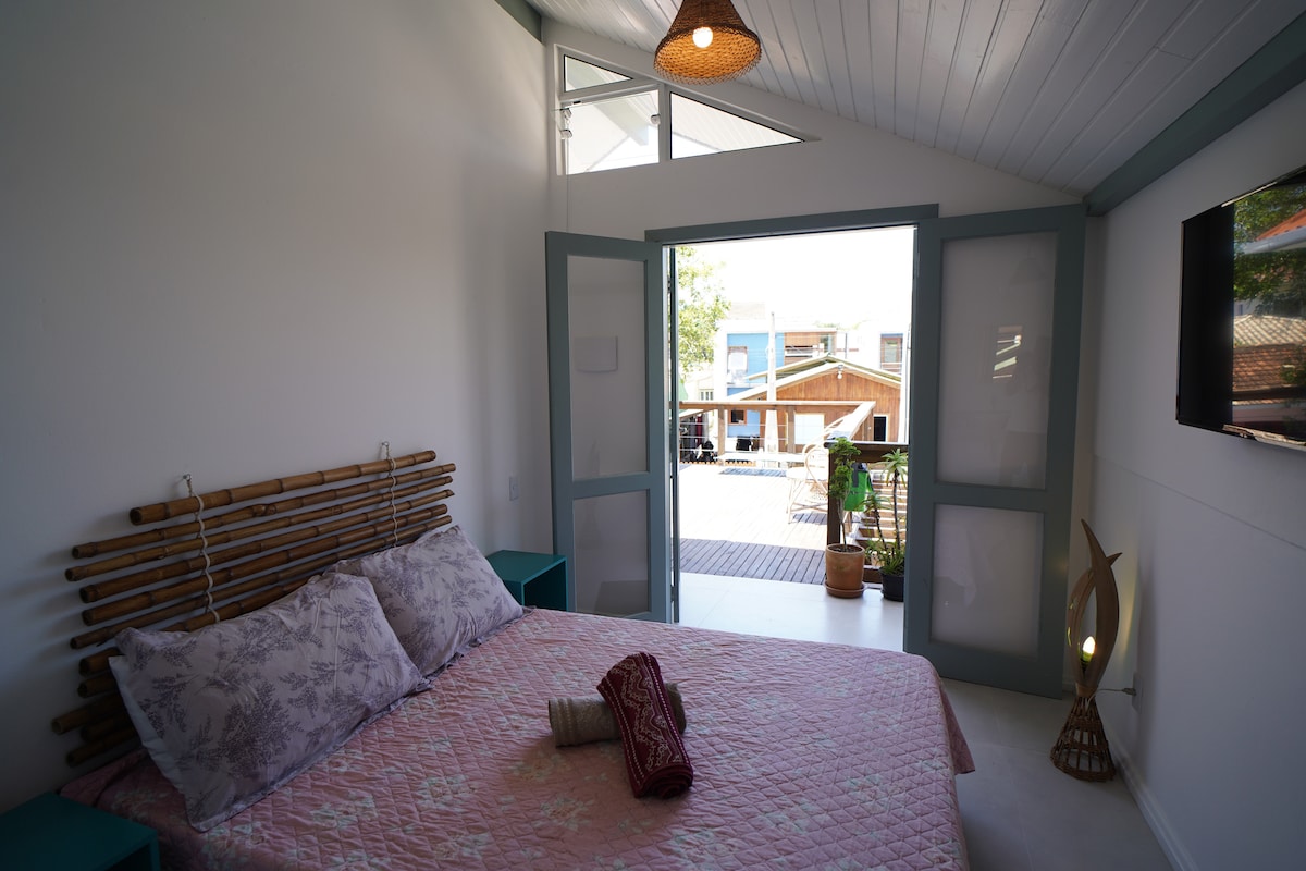 Acolhedora Suite para casal com varanda, rede e internet, a 250m da praia de Guarda do Embaú, Reserva Mundial de Surf. O quarto possui banheiro privado, cama casal com colchão de alta densidade, ventilador de teto, roupa de cama, varanda com rede e internet wifi. Temos uma cozinha externa de uso comum, equipada com fogão, geladeira, churrasqueira e utensílios. Espaço de estacionamento descoberto dentro do jardím.