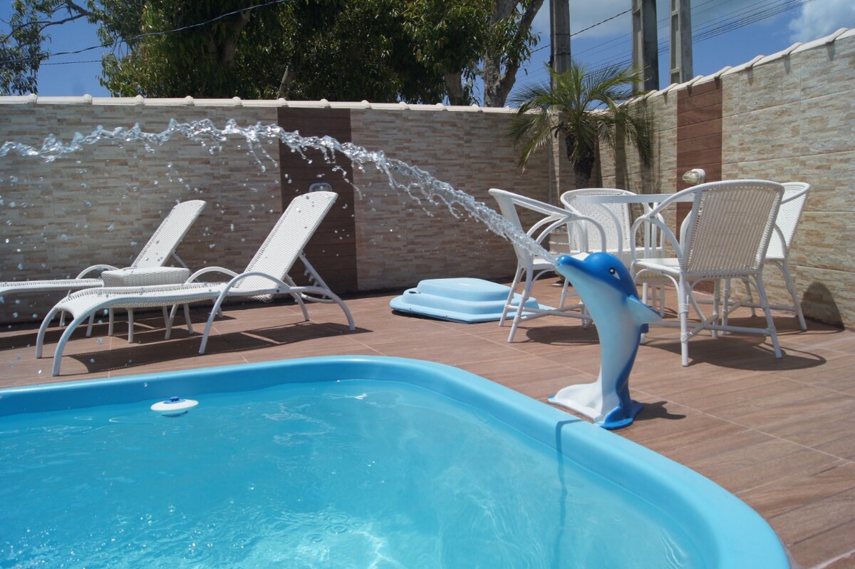 Casa com 2 quartos, mezanino no piso superior com 5 camas de casal, 1 banheiro e 1 lavabo, área grande com churrasqueira, piscina, vaga para 5 carros. Casa grande e ótima localização.