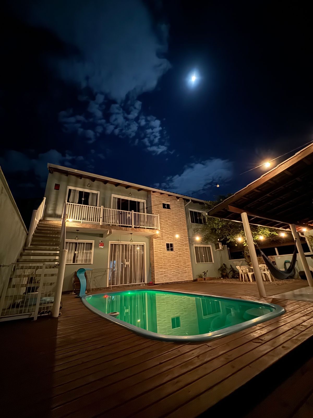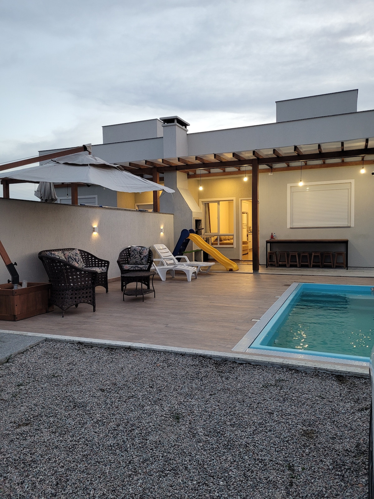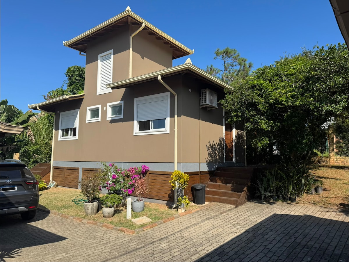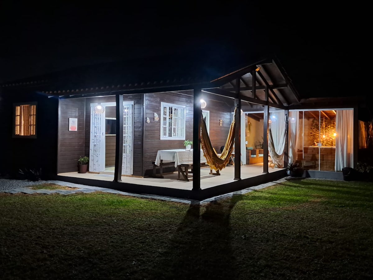 Casa ampla com 3 dormitórios. Primeiro quarto: 1 suíte com cama baixa queem, armário, ar condicionado. Segundo quarto com cama casal, armário e ar condicionado. 1 banheiro social. Segundo andar: mezanino com sofá cama e smart tv. Terceiro quarto com cama de casal queem, armário e ar condicionado. Sala e cozinha conjugada. Área externa com churrasqueira, redes, sofás rústicos para relaxar. Um banheiro sem chuveiro. Jardim, ducha externa. Estacionamento.