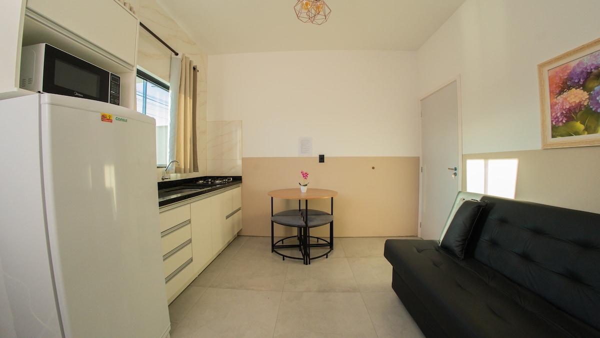 Estamos localizados na Rua principal da Praia da Pinheira, em frente ao Colégio e a 600 metros da Praia de Baixo. A kitinete acomoda até 4 pessoas, sendo com uma cama de casal e um sofá-cama de casal na sala. Cozinha completa com geladeira, fogão, microondas, e demais utensilios. TV com canais locais e com Amazon Stick com acesso a Internet. Um banheiro. Vaga de estacionamento para um carro.