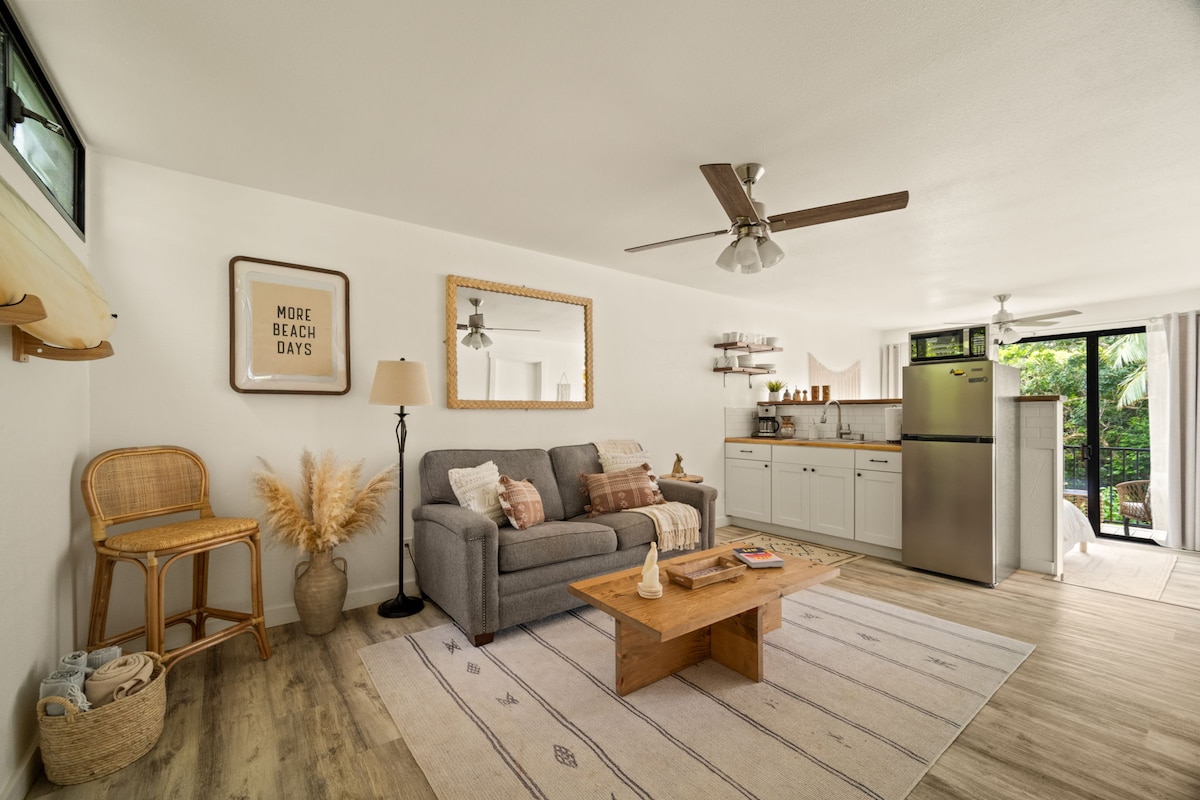 This beautiful remodeled studio is located on Kaua'i's lush and romantic North Shore. Furnished with A/C, VITAMIX Blender, Heavenly king size bed, kitchenette, hot plate, 2 flat screen tvs, and reliable wifi. Be ready to enjoy the breathtaking views and world class hiking, snorkeling, and beaches from this ideal North shore location. A quick walk to Hideaways Beach and Queen’s Bath and short drive to Hanalei. It’s more than just a vacation home, it's paradise!