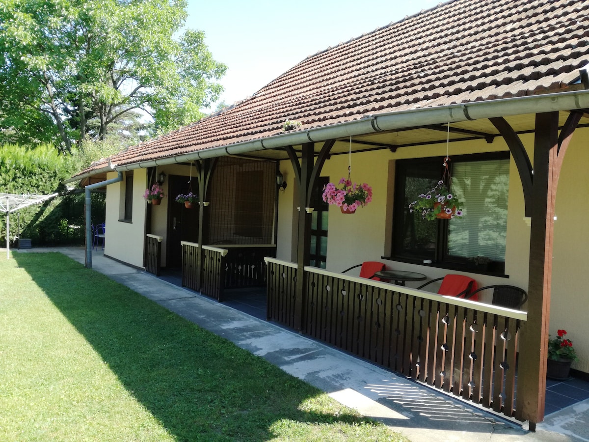 Natkrivena terasa za 10 ljudi sa rostiljem.Mirna zavučena kuća koja je potpuno opremljena za stanovanje. Odlična za odmor i druženje.U blizini jezero, vinarije i restorani. 1km od centra Palića