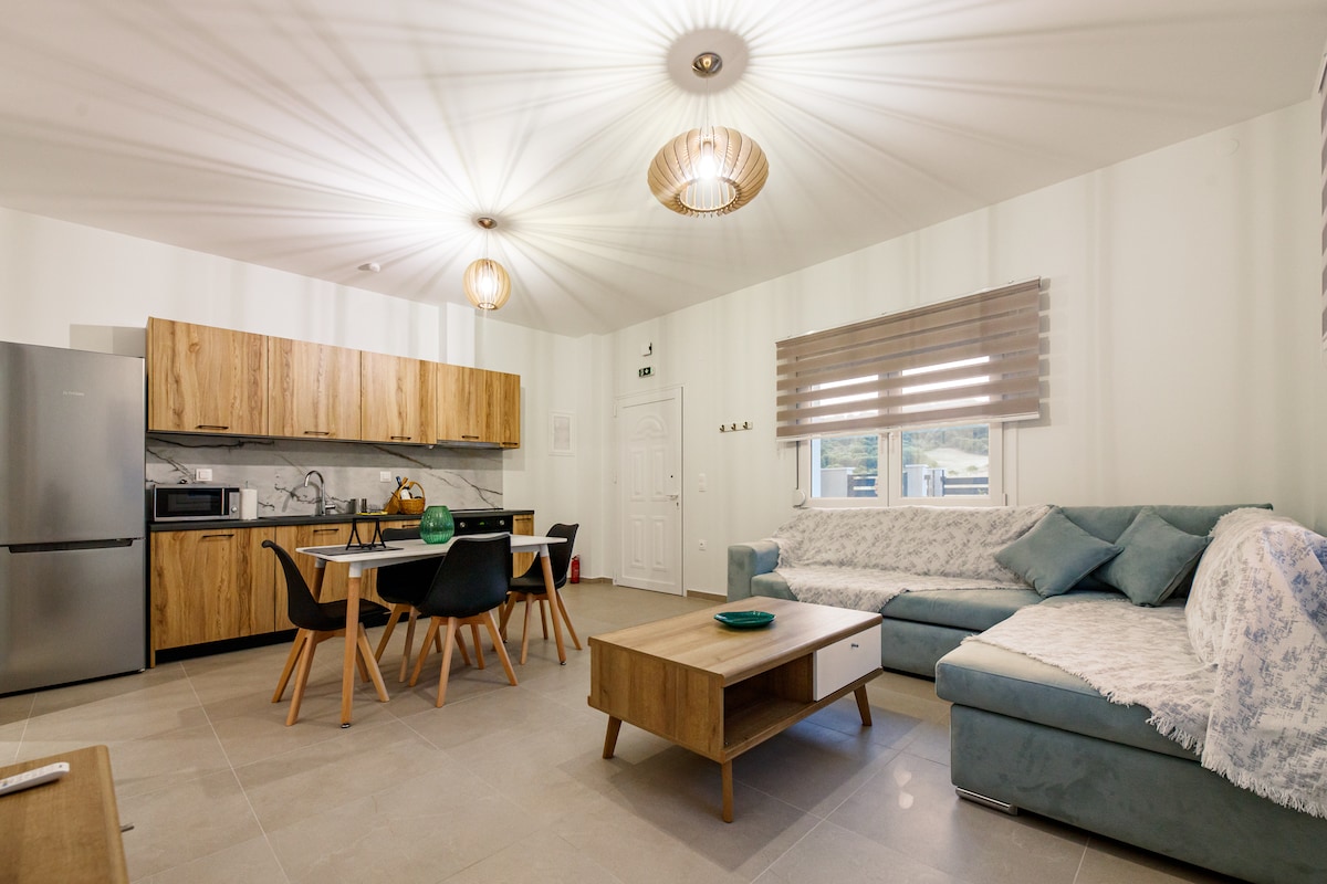 A fully renovated luxurious apartment in Nea Skioni, located in a quiet place, 200m from beach and 150m from restaurants, supermarkets and shops. Consists of 1 bedroom with queen size bed with his own AC, a bathroom ,a fully equipped kitchen with all electric appliances and cooking utensils, and a cosy living room with a sofa that turns to a queen size sofa bed, AC and satellite TV with Netflix. The apartment also have a private outdoor yard with dining table, BBQ and a outdoor furniture set.