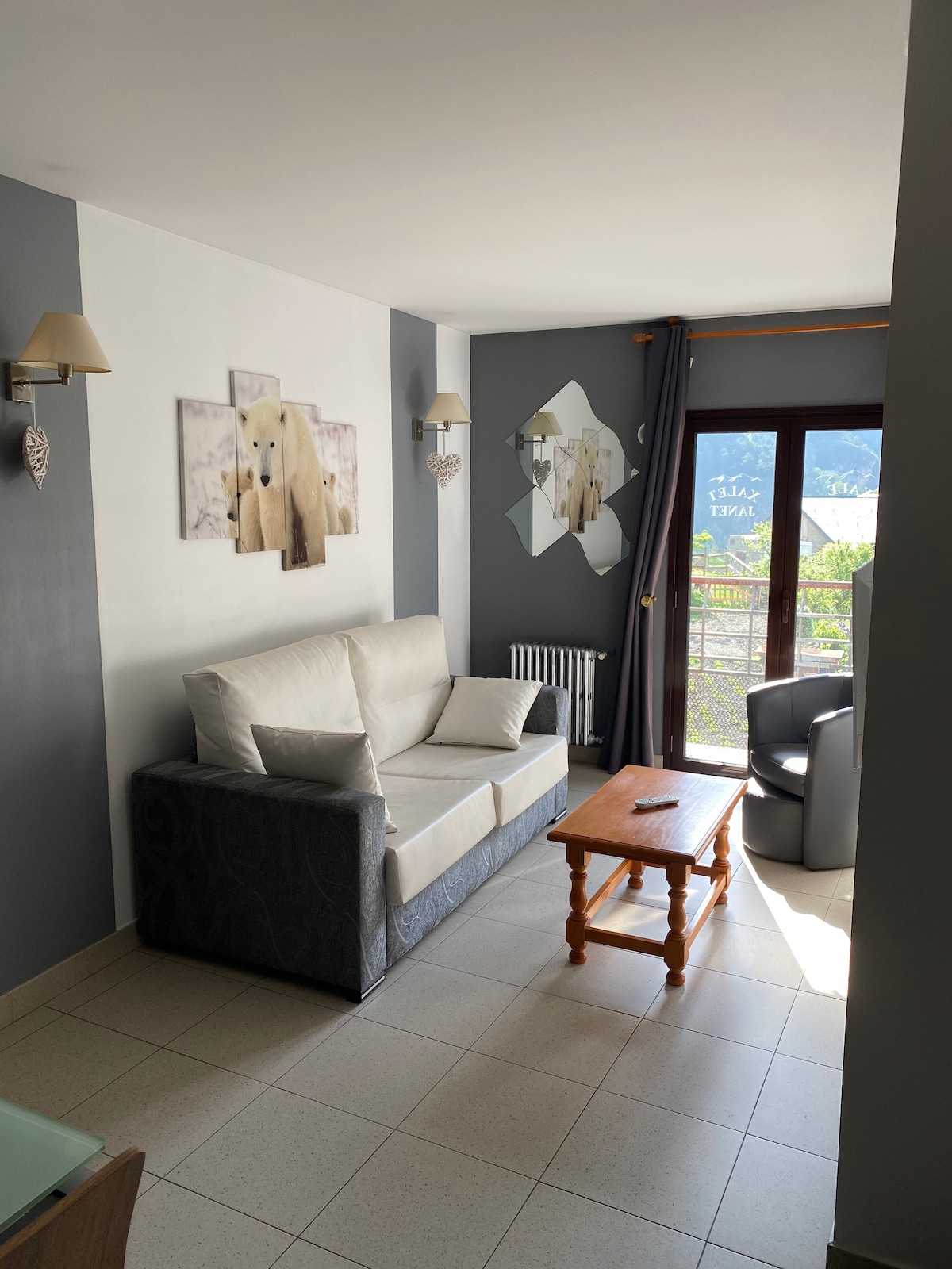 Bonito apartamento de montaña en el Pirineo, en Benasque.Vistas al pico de Cerler y selva de Conques, Terraza con mesa para comer y sofá, orientada al Sur. En una zona muy tranquila del pueblo, a sólo 5 kms de la estación de esquí de Cerler y del Parque natural Posets Maladeta. Para desconectar o teletrabajar. Wifi gratuita. dormitorio con cama de matrimonio de 180 cms. Y un sofácama en el salón que puede usarse como individual para un niñ@. Nuestro número de autorización turística es H-HU-487.