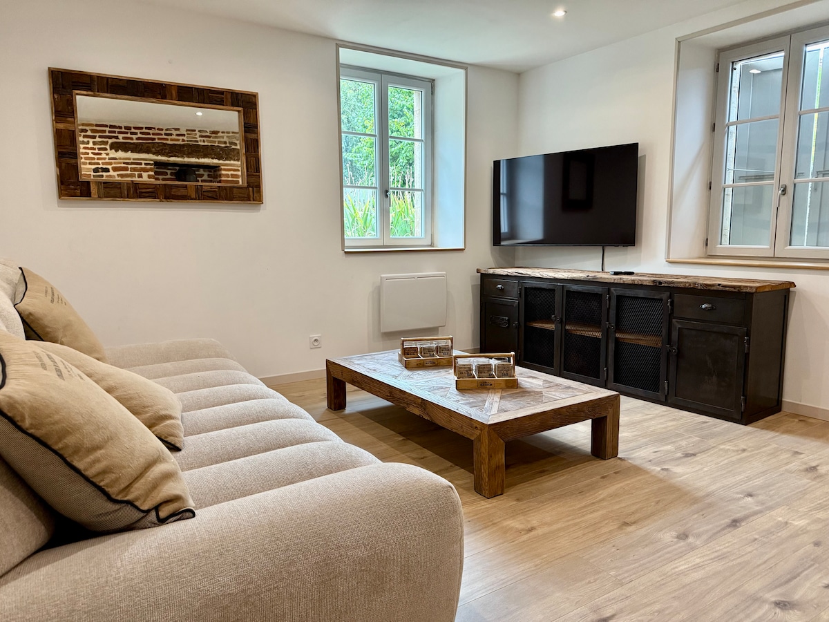Jolie petite fermette entièrement rénovée en Août 2020. 2 chambres 2 personnes avec chacune sa salle de bain privée. Couchage très confortable pour 2 personnes dans la pièce à vivre. Plus une 3ie salle de bain. Belle pièce à vivre avec cheminée , cuisine entièrement équipée, four ,lave vaisselle , micro onde ,cafetière appareils fondue,raclette,grille pain, lave et sèche linge. jeu de société ,Grand parc arboré 5000 m2 BBQ. Terrasse dans le parc. Parking couvert fermé pour plusieurs voitures. Commerce et restaurant à proximité Boucher bio du producteur à 50 mètre. Tout est réuni pour passer un week-end entre amis ,en famille en pleine nature.