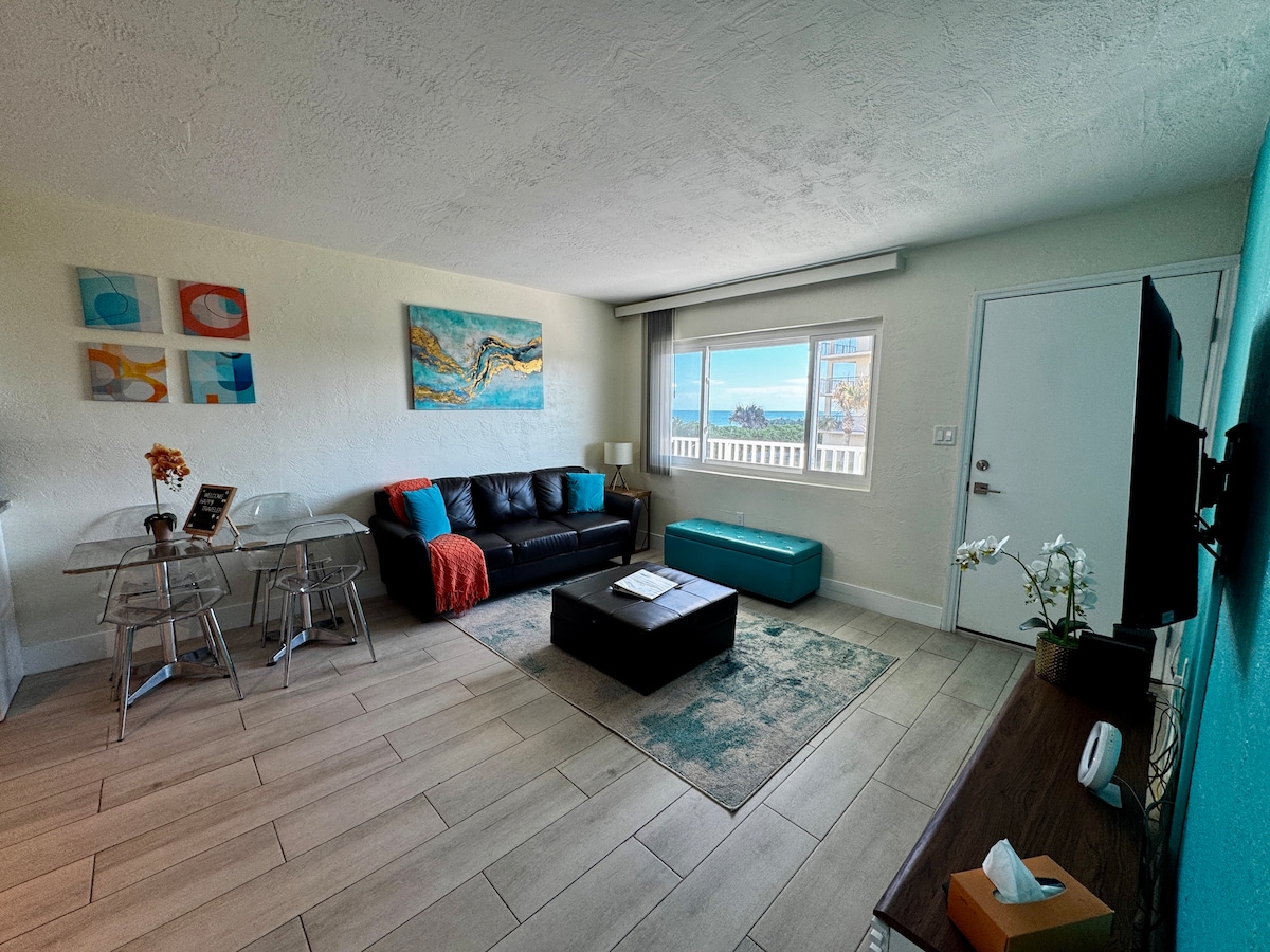 Steps from the sand! Upscale and spacious 1 bedroom, 1 bath suite. Breathtaking ocean views from every angle including triple glass slider, balcony, and oversized bedroom windows! See and feel rocket launches from the private balcony. Perfect for aquatic adventurers or close-knit friends. Tastefully appointed and newly renovated, expect an idyllic location for on-the-water fun with luxury for up to 4 guests Near Disney/Orlando Airport, Kennedy Space Center, Port Canaveral, Cocoa,Melbourne